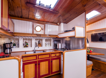 Der Salon ist gemütlich eingerichtet und bietet ausreichende und bequeme Sitzplätze. Man fühlt sich direkt wie zu Hause. Die offene Küche ist mit einem 2 x 4 flammigen Gasherd, einem Backofen und zwei Kühlschränken ausgestattet. Hier behält mann während des Kochens den direkten Kontakt mit den anderen Mitseglern. An den großen Tischen sitzt man gemütlich beieinander, genießt leckere Mahlzeiten und den Abend in geselliger Atmosphäre.