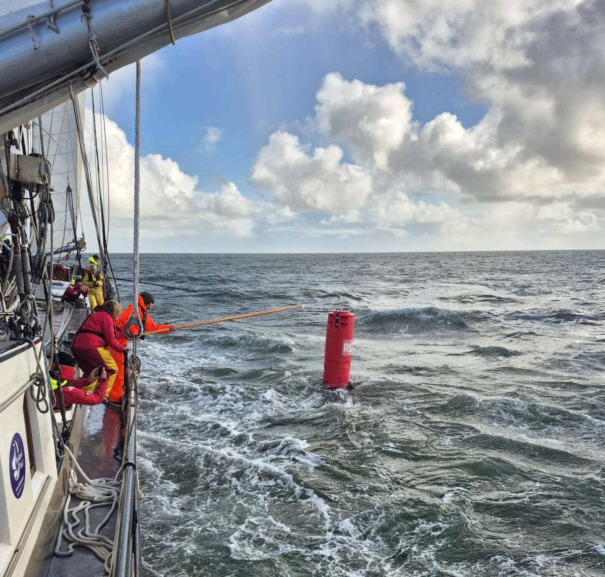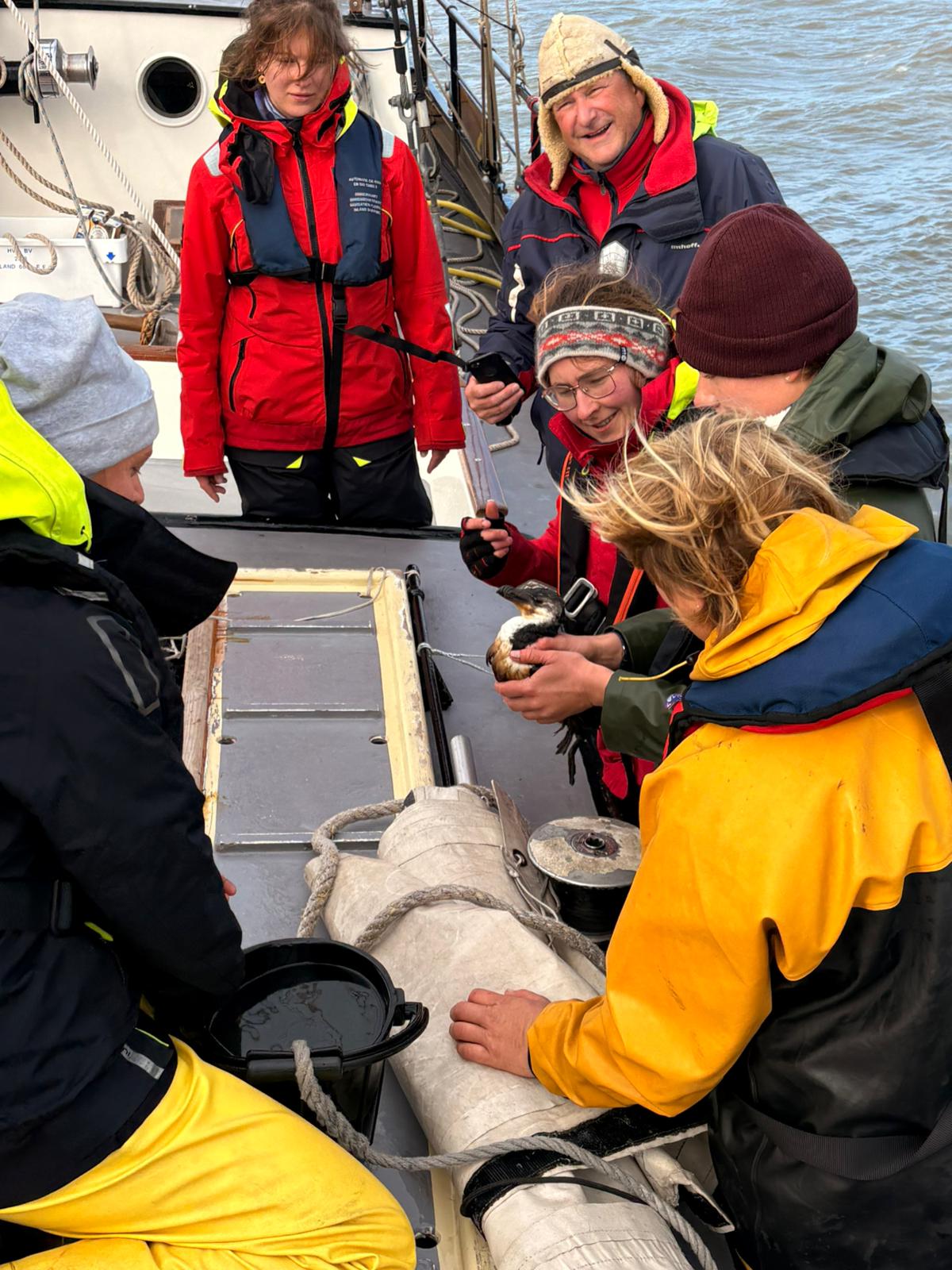 Mitten in dieser Anstrengung machte die Crew eine besondere Entdeckung: Ein mit Öl verschmutzter Alk wurde aus dem Wasser gerettet. Das Tier wurde gereinigt, gepflegt, erhielt den Namen Flip und wurde später auf Ameland – zusammen mit der Flagge für die Punkte – beim Hafenbüro abgeliefert.