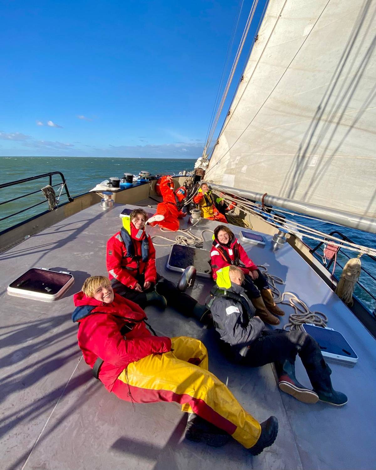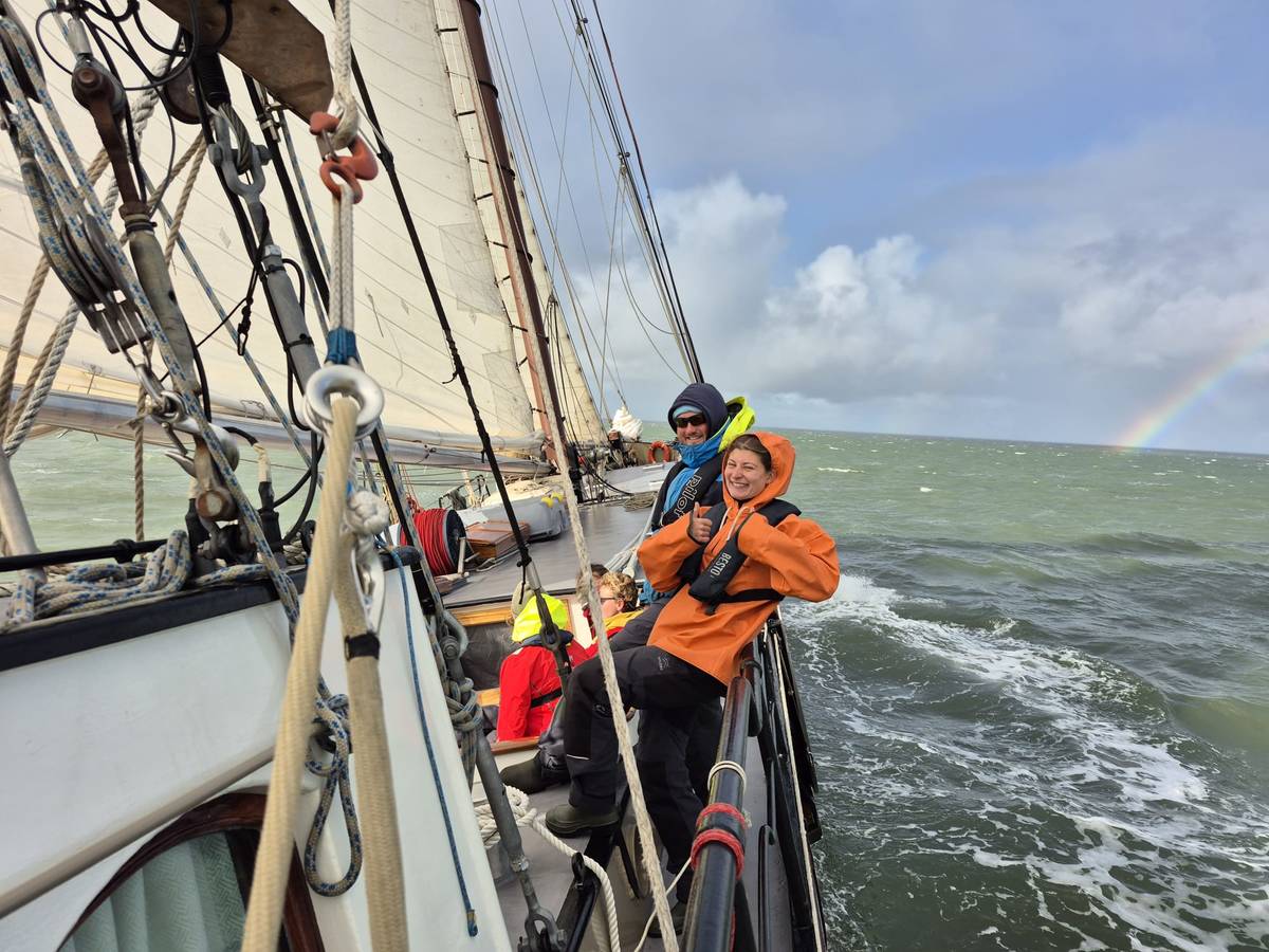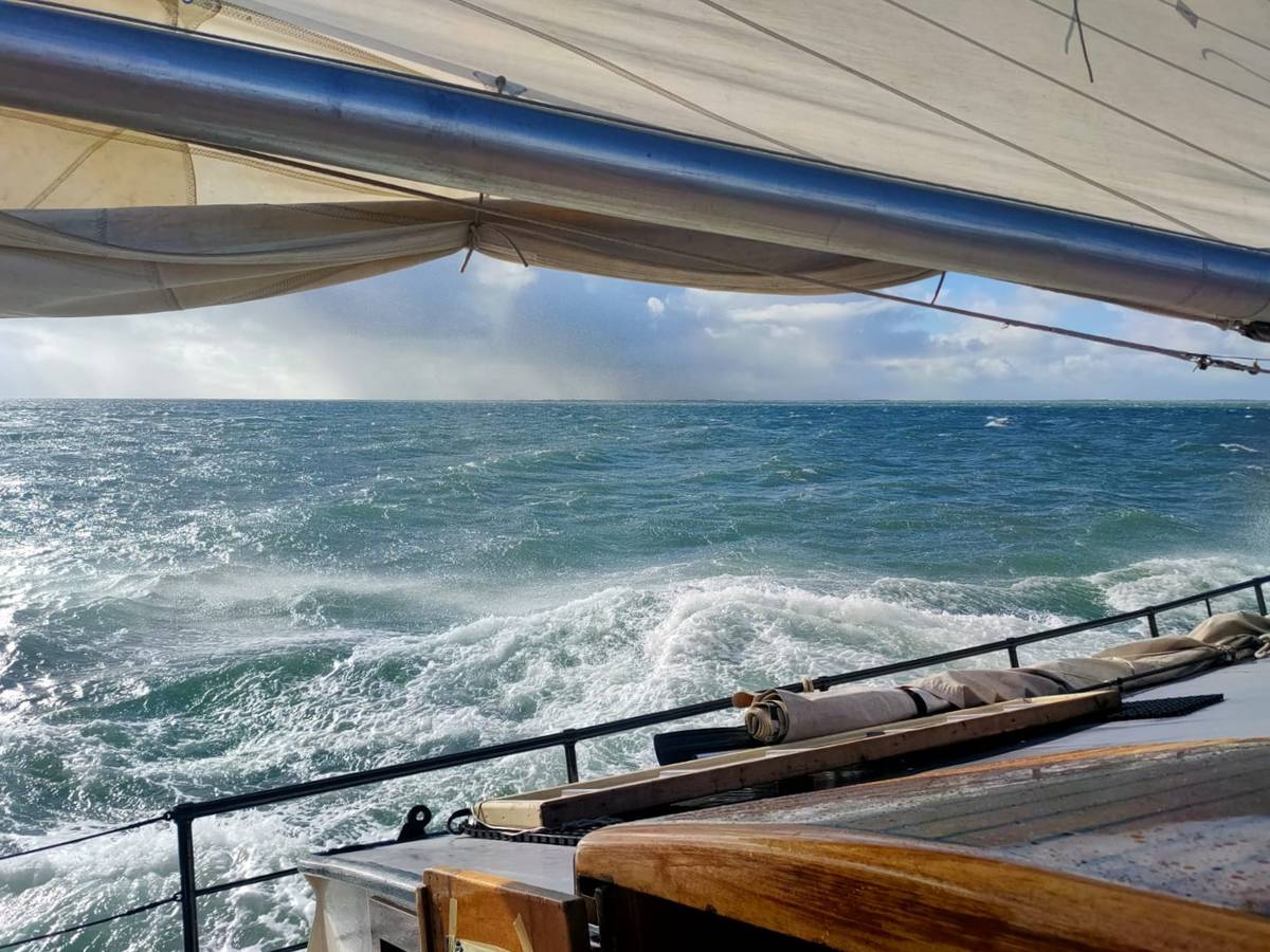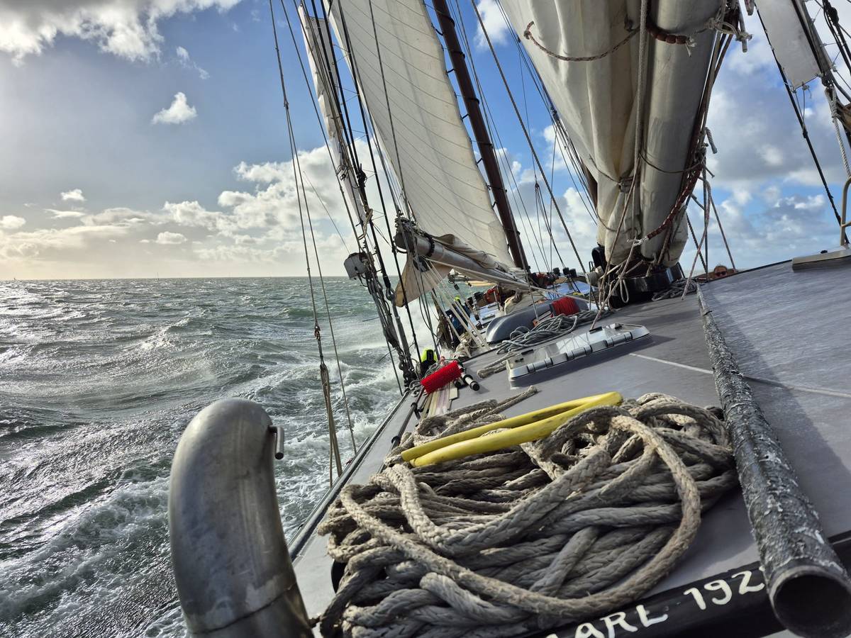 Der Wettbewerb begann mit starkem Wind – Windstärke sieben bereits beim Start in Harlingen. Nach einer kurzen Nacht und einem kräftigen Frühstück wurde die neunzehnköpfige Crew auf Vor-, Mittel- und Achterdeck verteilt. Jeder wusste genau, was zu tun war.